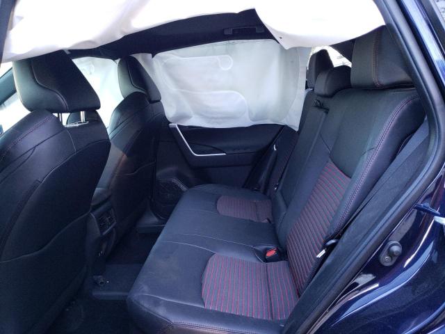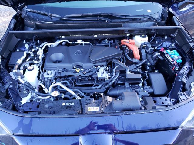 The 2021 RAV4 Prime XSE HV in blue presents a striking visual presence with its bold color choice complementing the model’s aggressive styling cues. The front end features a wide, chrome-accented grille flanked by sharp LED headlights that enhance visibility and modern aesthetics. The lower bumper includes aerodynamic air dams, which not only improve efficiency but also reinforce the vehicle's performance-oriented identity. Side profile highlights include 19-inch alloy wheels with black-finished spokes that add to its dynamic stance.