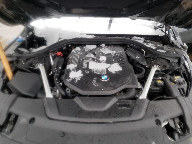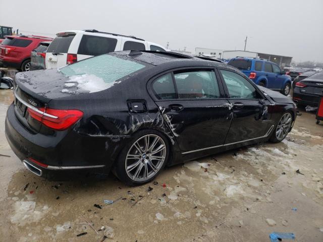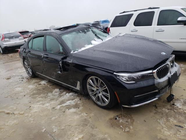 The 2018 BMW 740i sedan displays the brand’s signature design language with its elongated hood, short overhangs, and prominent kidney grille. The body is painted black, which enhances its sleek silhouette and gives it a sophisticated appearance suitable for both formal and urban environments.