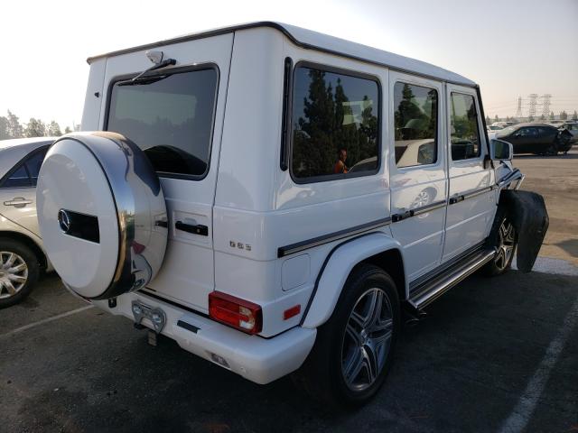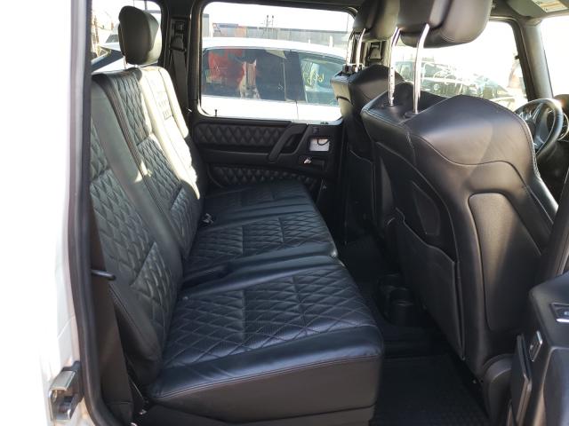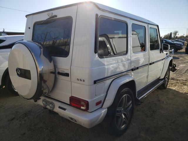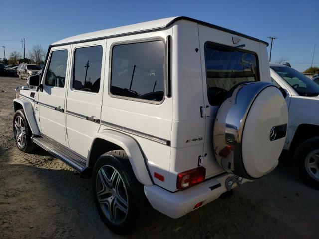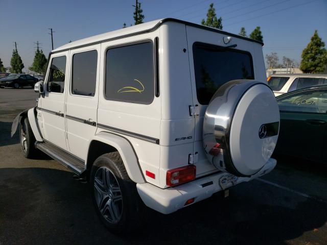 The 2016 Mercedes-Benz G 63 AMG retains the iconic boxy silhouette of the G-Class while incorporating aggressive AMG styling cues. The white body color enhances its bold presence on the road, with sharp lines and angular surfaces that emphasize strength and durability. The front bumper features a large air intake flanked by fog lights, contributing to both aerodynamics and visual impact.