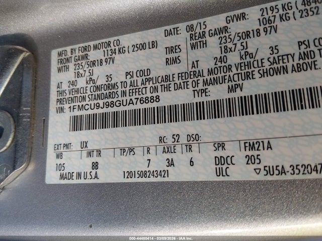 2016 წლის Ford Escape Titanium მოდელი, VIN: 1FMCU9J98GUA76888, გამოვიდა 2023 წლის ნოემბრში IAAI აუქციონში — კონკრეტულდება 10 ნოემბრის 2023, როგორც მონაცემები აღიქვა. აუქციონში მონაწერი გამოვიდა მეტაკონსულტაციის შემდეგ, რომელიც არის უფრო მაღალი ხარისხის დაზარალება. მონაცემებიდან შეიძლება გამოვიტანოთ, რომ მანქანა არ არის დაზარალებული, როგორც სახედარების შემდეგ. მონაცემები აღიქვა როგორც "Normal Wear & Tear", რაც ნიშნავს, რომ მანქანა უფრო არამართლი დაზარალების გარეშე არის დახვეწილი. მონაცემები აღიქვა, რომ მანქანა არ არის კონტროლის მიერ შეხვედურებული, როგორც ავტომატური ტრანსმისიის შემდეგ. 2026 წლის მარტში მონაცემები აღიქვა, რომ მანქანა არ არის დაზარალებული, როგორც ავტომატური ტრანსმისიის შემდეგ. მონაცემები აღიქვა, რომ მანქანა არ არის დაზარალებული, როგორც ავტომატური ტრანსმისიის შემდეგ.