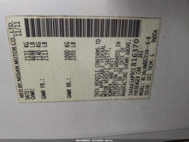 Pojazd 1N4AA5AP9CC816370, Nissan Maxima 2012 roku, został oferowany na aukcji IAAI w listopadzie 2023 roku. Pojazd był oferowany za cenę 12 000 dolarów amerykańskich i miał przebieg 170 855 mil (co odpowiada 274 963 km). Pojazd był zlokalizowany w Hudson, Florida. W momencie aukcji pojazd był w stanie "Run & Drive", co oznacza, że nadawał się do jazdy bez konieczności większych napraw. Pojazd był opisany jako "Rear, Unknown" – co sugeruje uszkodzenie tylnego końca pojazdu, ale nie ma informacji o rodzaju uszkodzenia ani jego stopniu poważności. Pojazd był oferowany przez P. W momencie aukcji pojazd miał przebieg 274 963 km i był w stanie "Run & Drive". Pojazd był oferowany za cenę 12 000 dolarów amerykańskich i miał przebieg 170 855 mil (co odpowiada 274 963 km). Pojazd był zlokalizowany w Hudson, Florida. W momencie aukcji pojazd był w stanie "Run & Drive", co oznacza, że nadawał się do jazdy bez konieczności większych napraw. Pojazd był opisany jako "Rear, Unknown" – co sugeruje uszkodzenie tylnego końca pojazdu, ale nie ma informacji o rodzaju uszkodzenia ani jego stopniu poważności. Pojazd był oferowany przez P. W momencie aukcji pojazd miał przebieg 274 963 km i był w stanie "Run & Drive". Pojazd był oferowany za cenę 12 000 dolarów amerykańskich i miał przebieg 170 855 mil (co odpowiada 274 963 km). Pojazd był zlokalizowany w Hudson, Florida. W momencie aukcji pojazd był w stanie "Run & Drive", co oznacza, że nadawał się do jazdy bez konieczności większych napraw. Pojazd był opisany jako "Rear, Unknown" – co sugeruje uszkodzenie tylnego końca pojazdu, ale nie ma informacji o rodzaju uszkodzenia ani jego stopniu poważności. Pojazd był oferowany przez P.