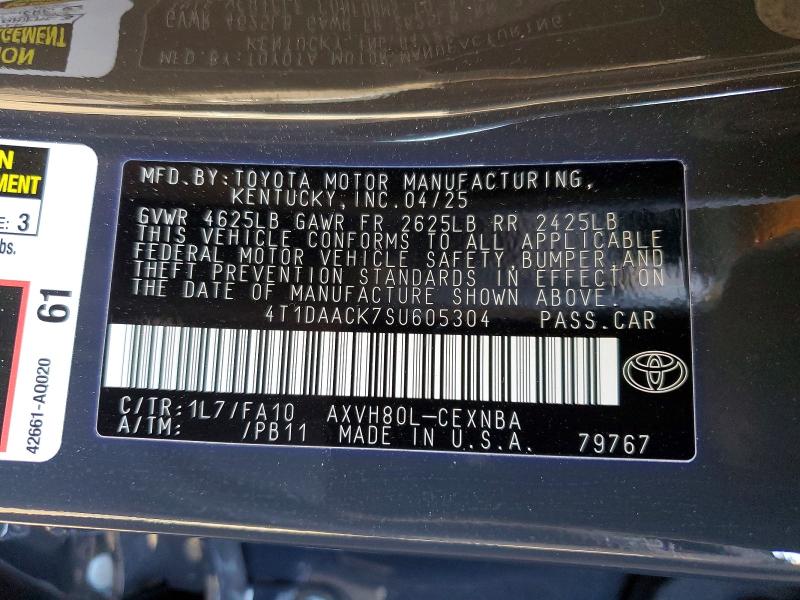 Запис історії автомобіля 4T1DAACK7SU605304 повністю підтверджує його походження з аукціону Copart у Колтон, штат Каліфорнія. Аукціон відбувся 26 жовтня 2023 року, коли автомобіль був оголошений як «Salvage Title» (знищена реєстрація), що означає, що він мав серйозну шкоду. Мильний показник на момент аукціону становив 9733 км (6048 миль).
