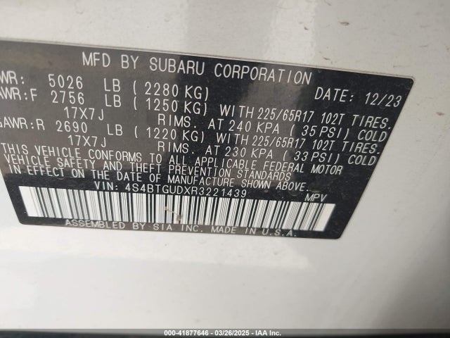 The most recent history record indicates that this 2004 Subaru Outback Wilderness vehicle with VIN 4S4BTGUDXR3221439 was listed for sale on December 31, 2025, by IAAI (Insurance Auto Auctions), located in Salt Lake City, Utah. The listing is marked as "Offsite," suggesting the vehicle may have been acquired through insurance or fleet liquidation channels.
