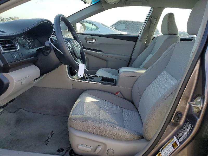 The 2015 Toyota Camry’s cabin offers a clean, functional design that emphasizes driver comfort and practicality. With its gray exterior and likely matching upholstery, the interior maintains a subdued elegance typical of this generation. The seats are upholstered in durable fabric with adequate cushioning, though long-term use may show wear—especially on high-contact areas like the seat bolsters and armrests. Dashboard materials feel mostly soft-touch plastics with some hard plastics around the lower console; these hold up well over time but can develop a slightly brittle texture after years of sun exposure. The center stack features an intuitive layout, with controls for climate, audio, and vehicle settings arranged logically within reach. The digital instrument cluster provides clear readouts, including trip information, fuel economy, and even a basic navigation indicator if equipped.