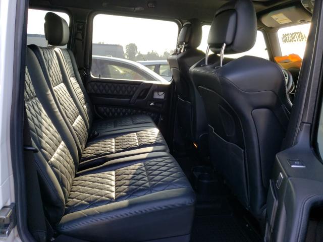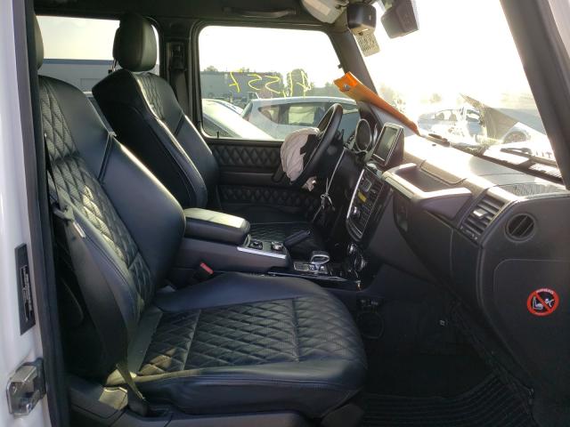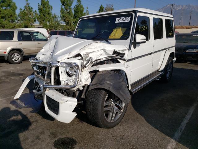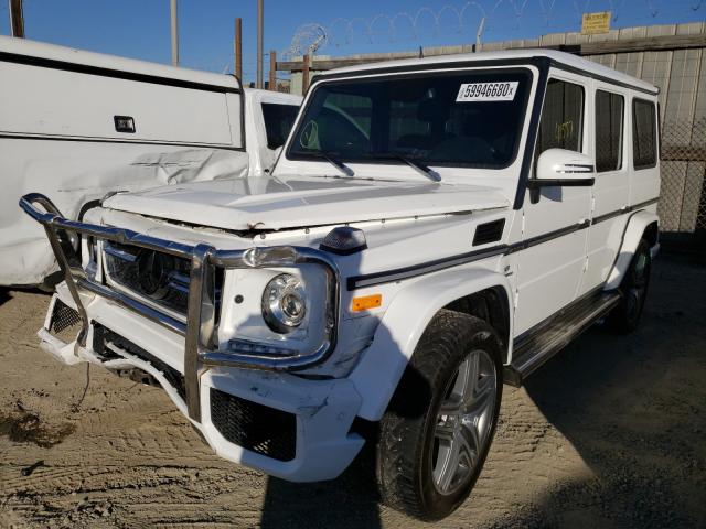 The 2016 Mercedes-Benz G 63 AMG retains the iconic boxy silhouette of the G-Class while incorporating aggressive AMG styling cues. The white body color enhances its bold presence on the road, with sharp lines and angular surfaces that emphasize strength and durability. The front bumper features a large air intake flanked by fog lights, contributing to both aerodynamics and visual impact.