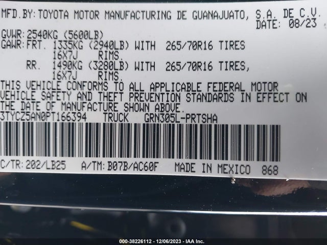 Pojazd o VIN: 3TYCZ5AN0PT166394 został oferowany na aukcji IAAI w dniu 2 listopada 2023 roku, w lokalizacji Scranton, Pensylwania (US PA - SCRANTON). Na tym etapie przebieg wynosił 1830 km (czyli ok. 2945 km w przeliczeniu na kilometry), co sugeruje bardzo niską intensywność użytkowania. Kolejny wpis datowany na 21 grudnia 2023 roku potwierdza fakt, że pojazd był uprawniony do sprzedaży jako „Run & Drive” – oznacza to, że pojazd może być uruchomiony i prowadzony bez konieczności dodatkowych napraw. Z danych wynika, że pojazd został zakupiony na aukcji za wartość szacowaną w wysokości 54 223 USD (retail value), podczas gdy wartość naprawy wyniosła 30 113 USD – co sugeruje, że pojazd był niewielko uszkodzony i nadawał się do sprzedaży po remontach. Kolizja w części przedniej po prawej stronie (Right Front) była podstawową przyczyną uszkodzenia, a jej skutki zostały usunięte poprzez naprawę zawieszenia. Brak informacji o wypadkach z powietrznymi poduszkami (airbags status: not mentioned), co sugeruje, że poduszki nie były aktywowane – prawdopodobnie z powodu niewielkiego uszkodzenia. Lokalizacja aukcji (Scranton, PA) wskazuje na południowy zachód USA, co może wpływać na warunki eksploatacyjne pojazdu – np. śnieg i zimno nie były głównym czynnikiem uszkodzenia.