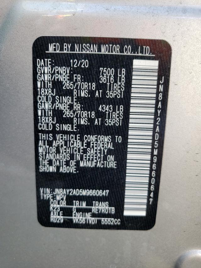 Nissan Armada SV 2021 року оснащений потужним бензиновим двигуном 5.6 літрів, який виробляє значну кількість потужності та обертальний момент. Цей двигун є однією з найбільш популярних опцій для цього класу автомобілів, оскільки він забезпечує високу динаміку та ефективність. Трансмісія — автоматична, яка має 7 передач, що забезпечує гладке переключення між режимами. Привод — 4x2 (задньо-привідний), що дозволяє зберегти енергію та зменшити вагу автомобіля, а також покращити керованість. Автомобіль має загальну масу 7001–8000 фунтів (3175–3629 кг), що відповідає класу 2F за класифікацією NHTSA. Колір — сірий (Gray), який є стандартним для цього моделювання. Автомобіль має пробіг 7129 км, що вказує на дуже низький рівень використання. Такий пробіг, разом з тим, що автомобіль був проданий на аукціоні Copart у 2023 році, може свідчити про те, що автомобіль був використований дуже обмежено — наприклад, як запасний автомобіль або для коротких поїздок.